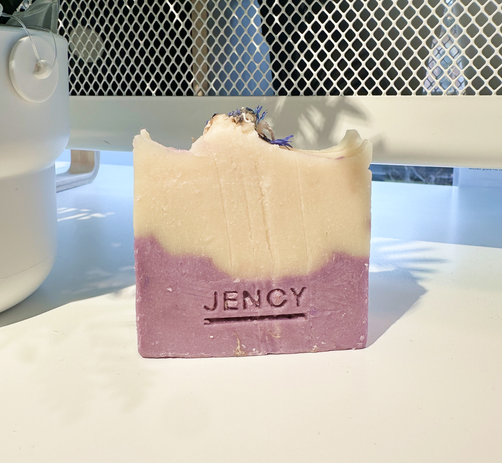 Olive Oil, Coconut Oil, Cornflower, Purple Mica, Milk, Lavender Essential Oil